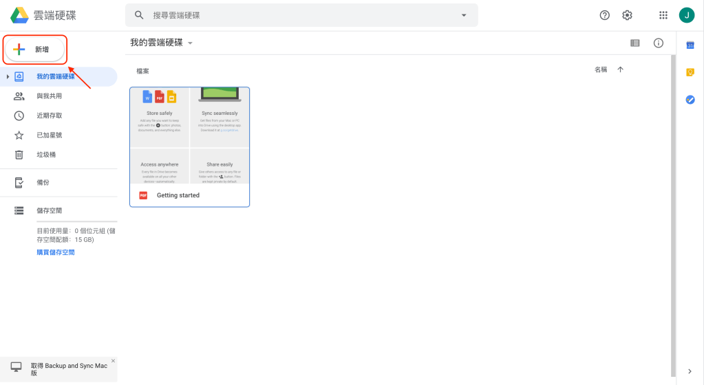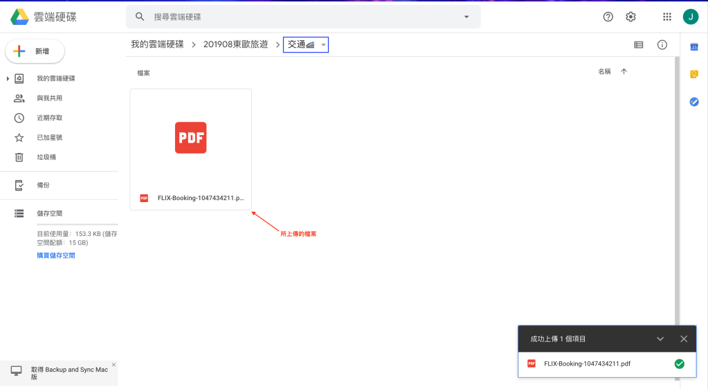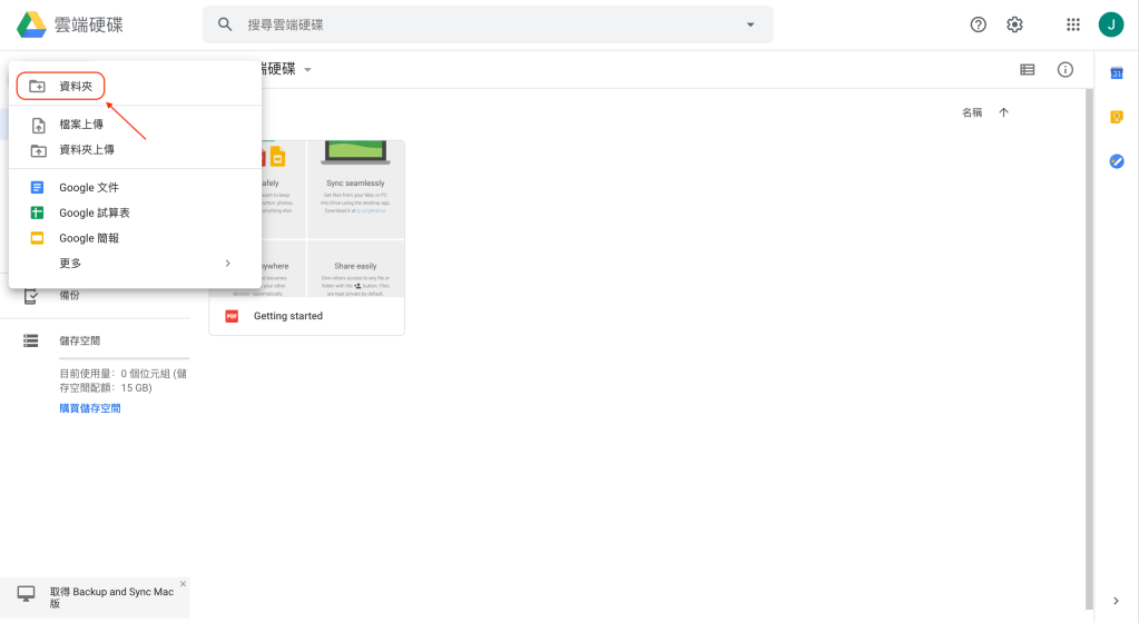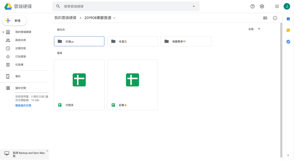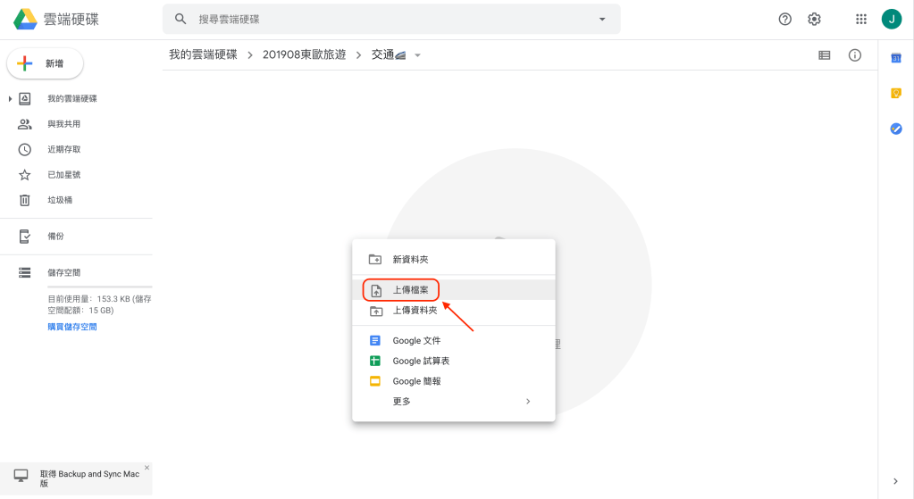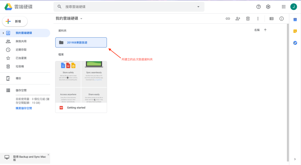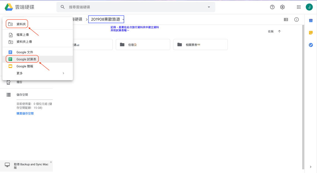 在Google雲端硬碟中,「新增」一個資料夾專屬這次旅行的資料夾。