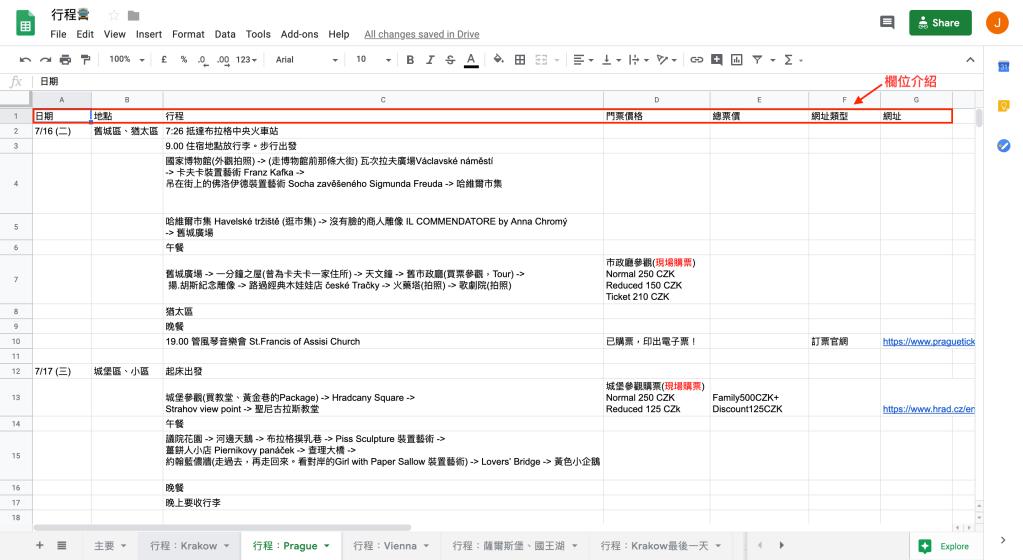 其他分頁:在其他子分頁的部分則可以規劃每一天較為詳細的行程,並將相關資訊整理出來。對我而言,在事前規劃重要的資訊除了有行程細節之外,景點的門票、官網開放時間的連結資訊或是其他相關資訊是很重要的,因此特別列出了相對應的欄位,分別是:門票價格、總票價、網址類型、網址。「門票價格」和「總票價」的記錄,讓我可以快速掌握旅行中的潛在花費;「網址類型」和「網址」則幫助我快速連結到相對應的資訊網站,例如:官網-開放時間、部落格-遊記分享。