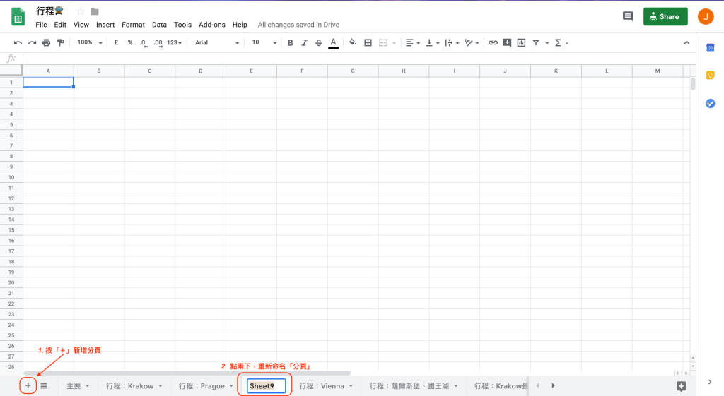 在試算表的左下角,有一個「+」號,按下去即可新增分頁。在所新增的分頁點兩下,即可重新命名分頁。