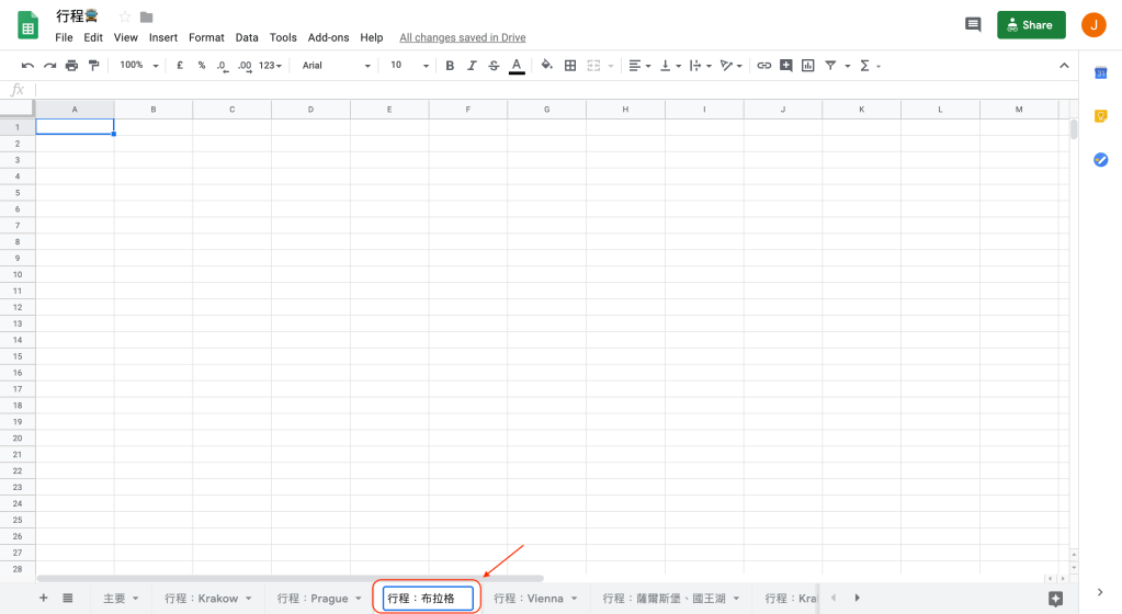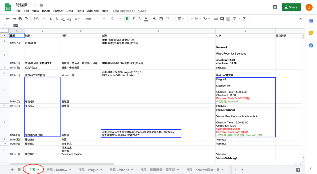 在行程表中,第一個分頁命名為「主要」,記錄這次旅行中每天的大方向行程,包含:日期、大致的旅行區域、大致行程、已確定的交通時間、住宿地點,以便快速掌握每一天的重要資訊,避免發生像是忘記而錯過搭車時間的悲劇。然後可以再建立其他的分頁規劃當日詳細的行程細節。