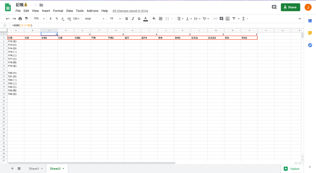 步驟一:建立類別項目。依序為:日期、住宿、住宿$、交通、交通$、門票、門票$、超市、超市$、食物、食物$、紀念品、紀念品$、其他、其他$。