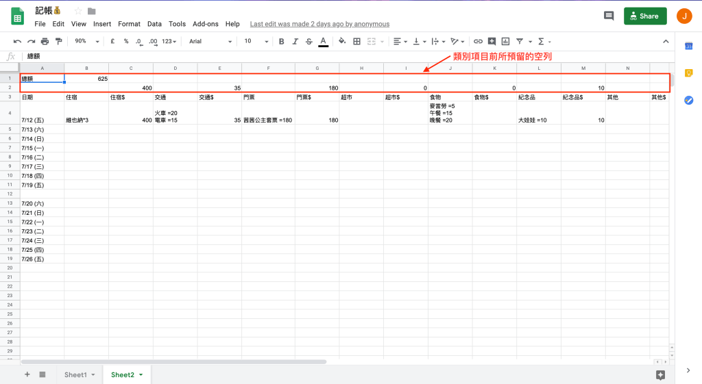 步驟二:將前兩列留空,以留給記錄各項花費金額的加總。如下圖: