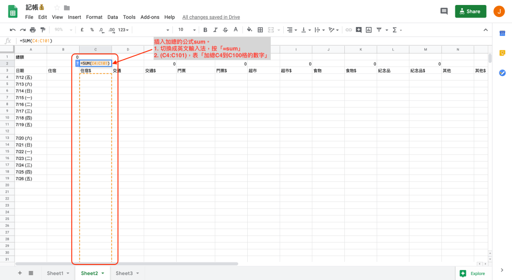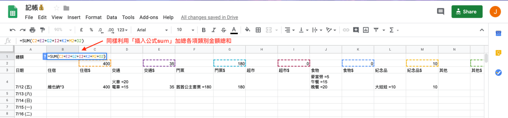 步驟三:類別金額計算:於標有「$」符號的欄位最上頭插入試算表公式sum,加總此列數字。