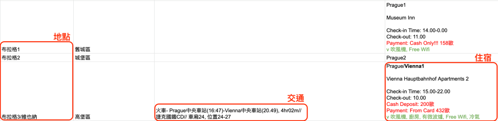 交通:以「交通工具-起始地(時間)– 目的地(時間)」為主要格式,例如:「火車-布拉格中央火車站(16:47)– 維也納中央火車站(20:49)」。另外則可以利用「//」加註此次搭乘的重要資訊,例如:搭乘時間、火車類型、車廂、座位……等相關資訊。