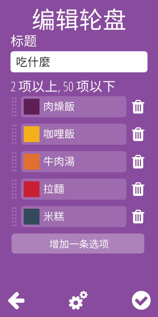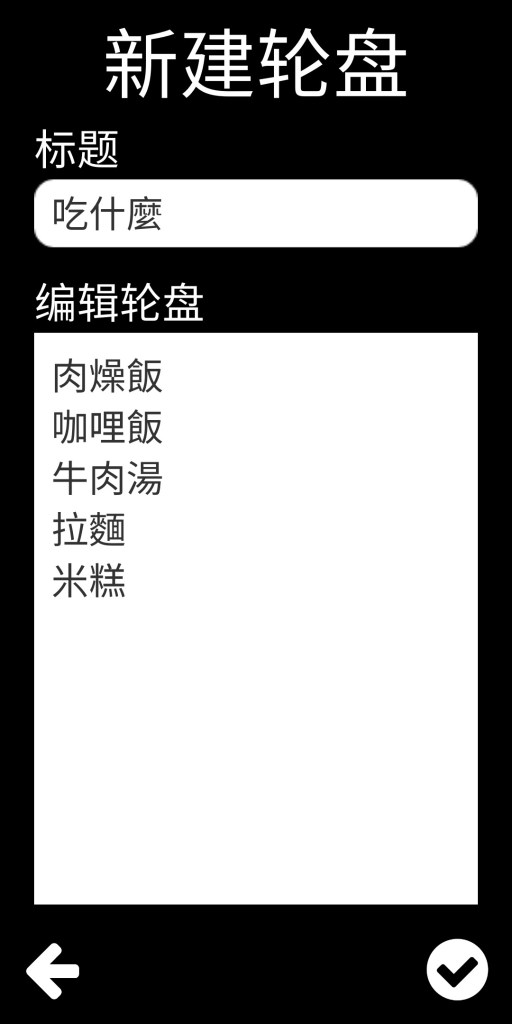 步驟四:輸入標題「吃什麼」,並將剛才Google地圖中的食物類別,打在下方的編輯輪盤處,確定後打勾跳至輪盤主頁面