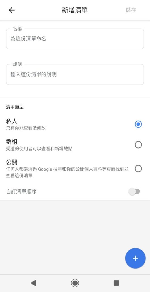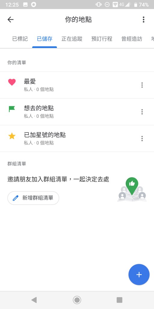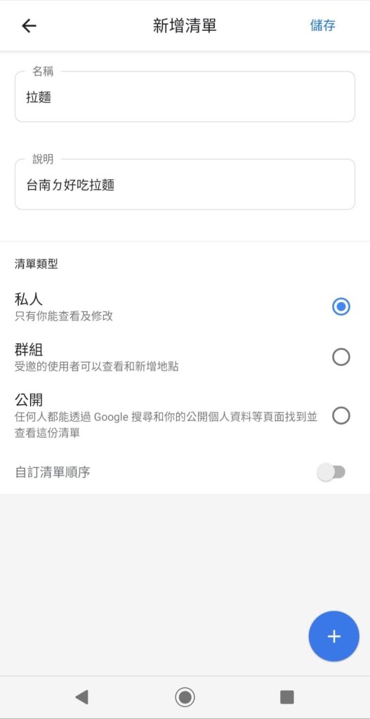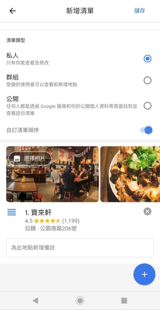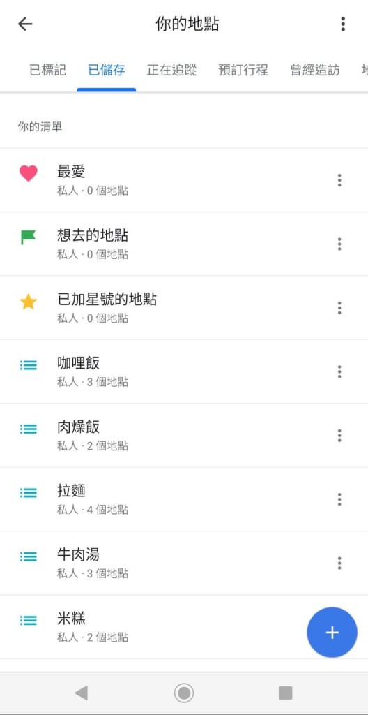 步驟二:切換至已儲存窗格,點選右下角+號,開始新增美食清單