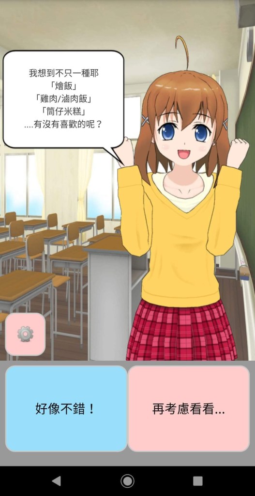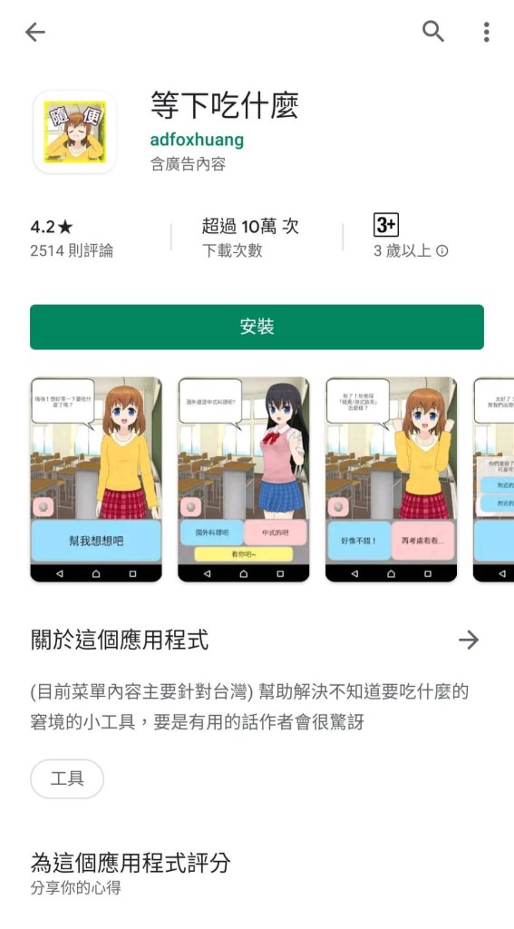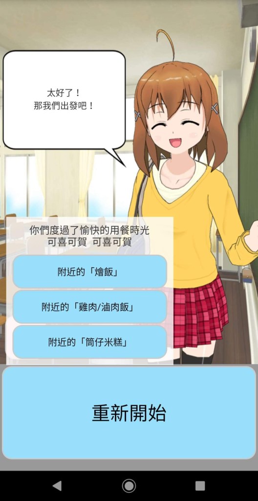 第一個方法要使用的懶人APP「等下吃什麼」(目前僅支援Android系統),採用二選一的方式,步步引導使用者選出當下想吃的食物。一點開這個應用程式,即可以看到可愛的NPC,經過一連串的選擇後,會得到NPC所推薦的食物類別,選我有興趣,將會連接到GOOGLE地圖,並搜尋附近該類別的食物。