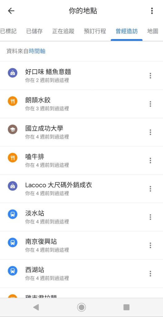 在我們剛剛有使用過的「你的地點」中,其實有一個窗格叫做「曾經造訪」,此功能會紀錄過去幾個月內曾經到過的地方,但前提是必須開啟定位功能,進去後點選該地點可以直接看到店家資訊,並利用「儲存」功能加入美食清單