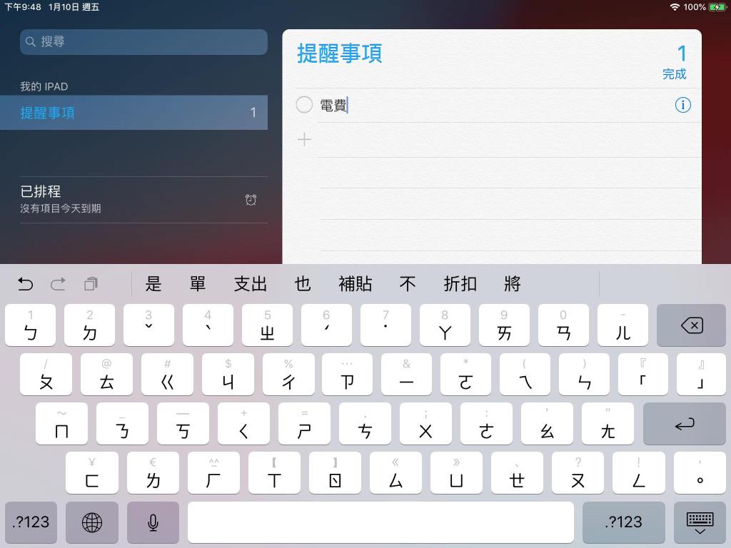 點選繳費的日期後,按右上方的+號就可以進行設定了,一樣都可以設定提醒時間跟提前多久提醒。但ios的行事曆真不愧是人性化的設計,他會把你原先設定的開始結束時間"畫"在你的行事曆上,就像平常排課表這樣,所以若是平常有使用此app 來排行程的話,這就不是一個好選擇了,因為可能會和行程重疊,看起來不太好看。所以這邊在介紹另外一種ios內建的app-提醒事項,這個app聽名字就知道是專門用來設定提醒事項的。一樣我們打開程式後:
